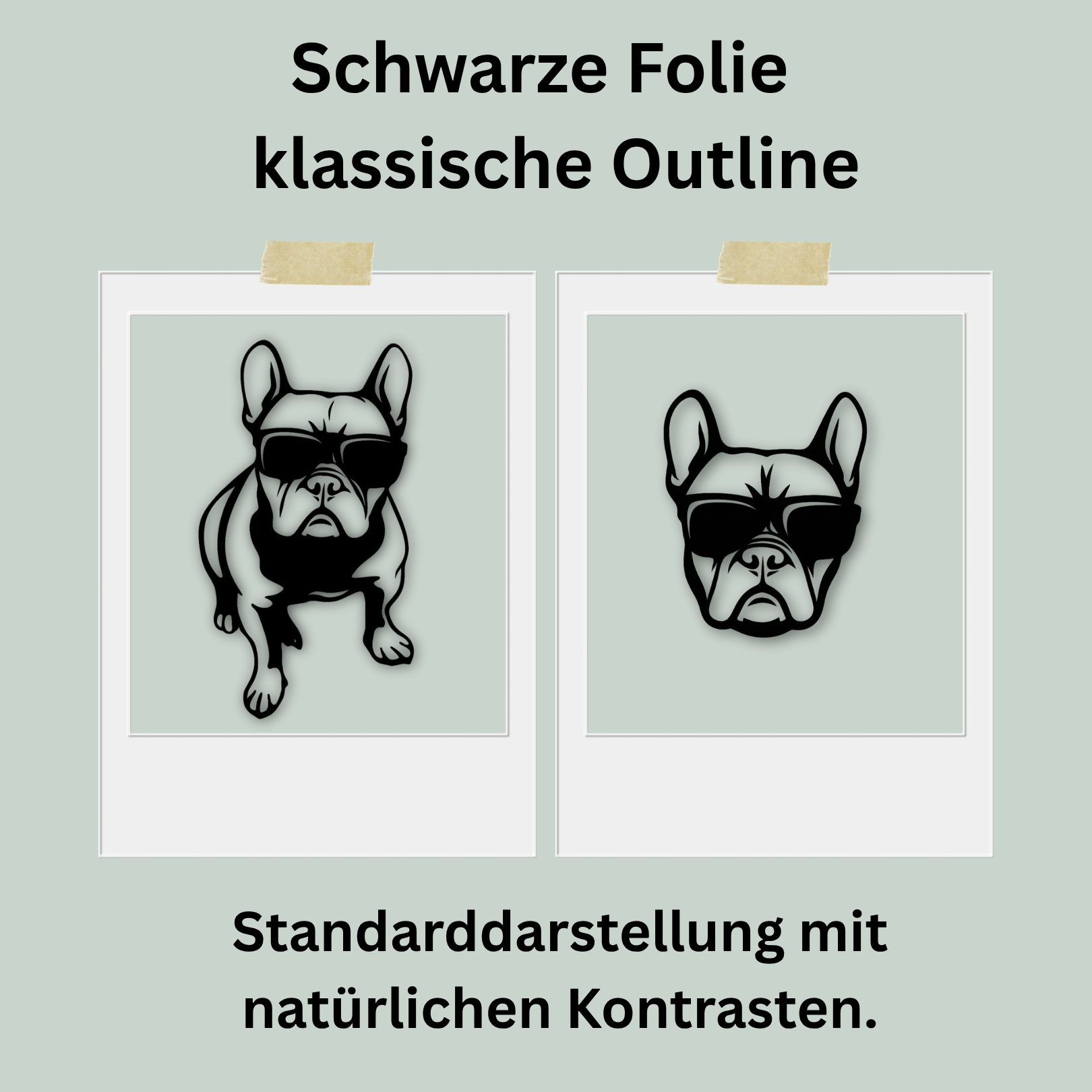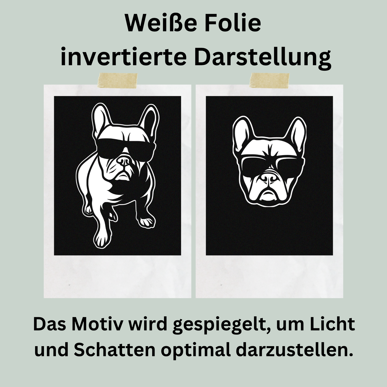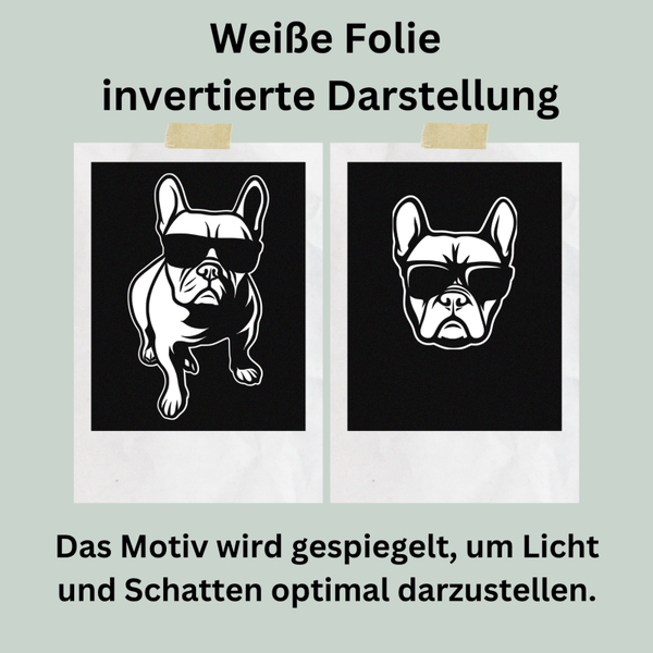 Bei weißer Folie wird das Motiv invertiert, damit Licht und Schatten natürlich wirken und dein Tier klar erkennbar bleibt – im Gegensatz zu einfach "weiß gefärbten" Motiven, die an Tiefe verlieren.